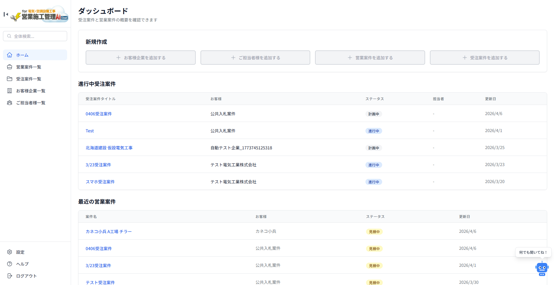 ログインするとまず表示されるダッシュボード画面。進行中の営業案件・受注案件の一覧や、最近の営業案件をひと目で把握できます。新規作成ボタンから営業案件・受注案件・お客様企業をすぐに登録できるので、日々の業務がスムーズに始められます。
