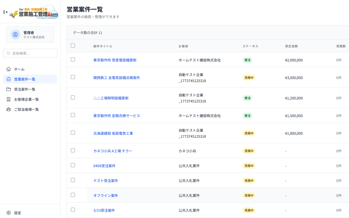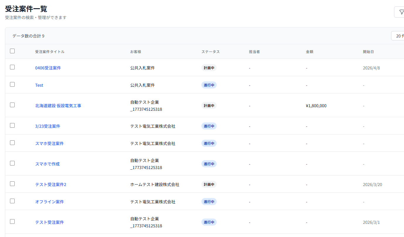 営業案件が受注に至ったら、受注案件として管理することもできます。受注済み案件の一覧画面で顧客名・金額・ステータスを確認でき、施工中の案件の全体像を俯瞰できます。